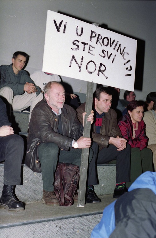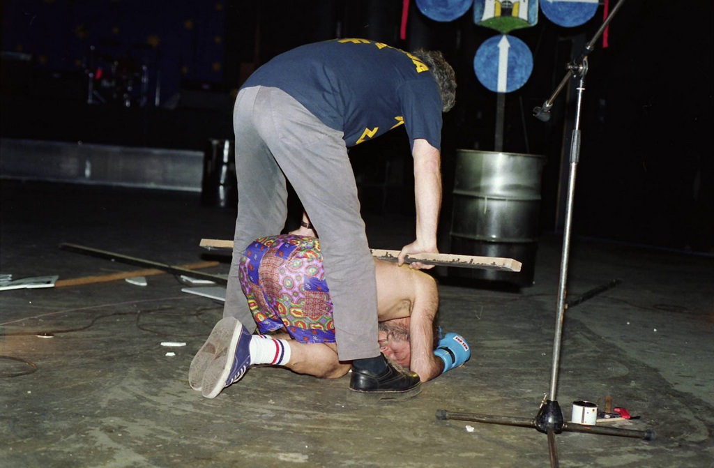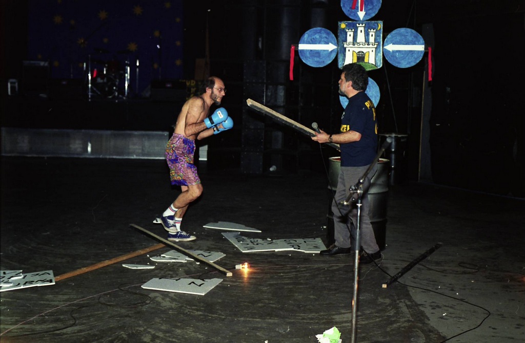 In this dialogue two characters, one from the city center and the other from the countryside, are having a verbal conflict, each defending his own values. Performance ends with their physical conflict during which the character from the countryside is defeated. The performance depicted the cultural, economical and political situation in Croatia where cultural, economical and political powers are centralized.