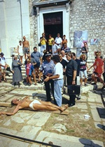 While performing, a Mass was being held inside the church. After Mass, a priest, who’d come out of the church and was shocked by our performance, immediately called the police. He explained we were insulting the Faith and didn’t have the right or license to use a man as Christ or to make of him for sale any relics. When a policeman arrived, he requested our identification for the purpose of prosecution, and we were forced to stop the performance. We were sued by the police for disturbing the peace, but the judge dismissed the case. This incident caused a big stir in Croatia regarding freedom of expression and the position of Church and State vis-à-vis individual freedom.